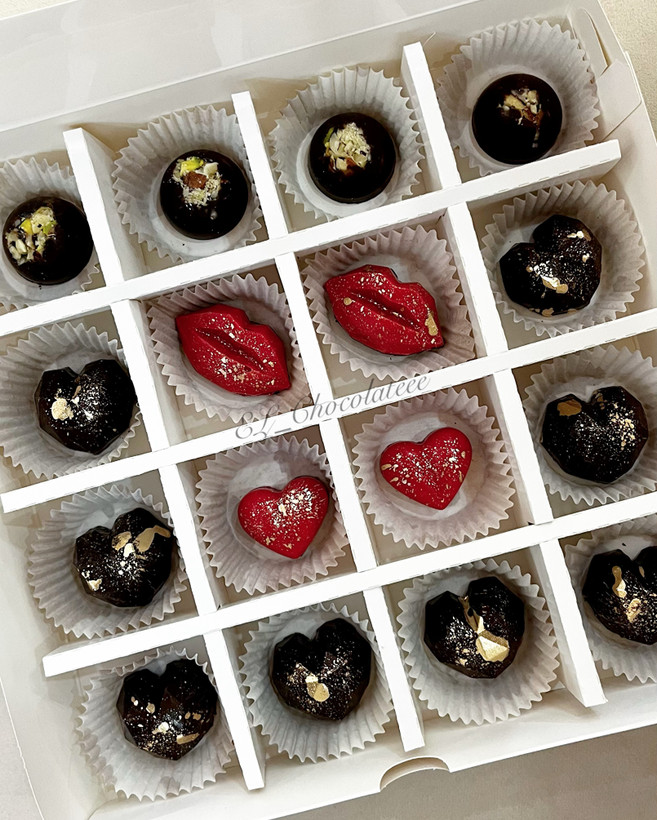 شما میتوانید شکلاتها را در سه طعم تلخ، شیری و سفید سفارش دهید و فیلینگ دلخواهتان را از میان گزینههای موجود در اسلاید آخر انتخاب کنیدو در قسمت توضییحات بنویسید.