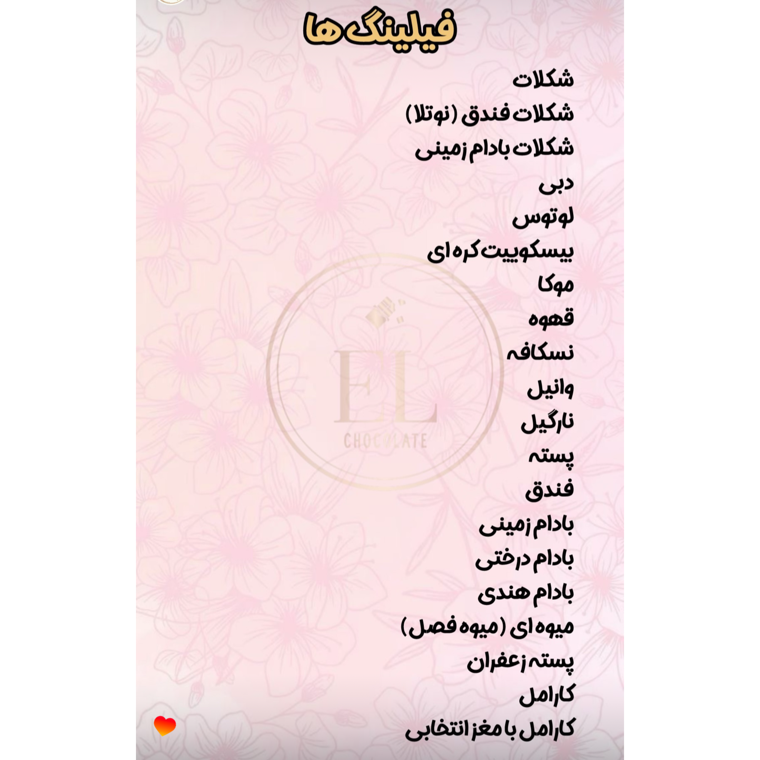 شما میتوانید شکلاتها را در سه طعم تلخ، شیری و سفید سفارش دهید و فیلینگ دلخواهتان را از میان گزینههای موجود در اسلاید آخر انتخاب کنید و در قسمت توضییحات بنویسید.